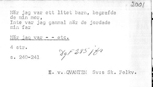 //// - c4UU{ //// När jag var ett litet barn, be gr af de l //// de min mor, L //// Inte var jag gammal när de jordade min far //// När jag var - - etc» //// s. 240-241 //// /E. v..QVANTZN Sv:s Sk. Folkv. | //// i ////