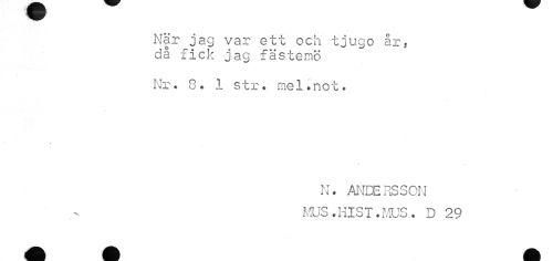 //// ^Hj //// När jag var ett och tjugo år, då fick jag fästemö //// Nr. 8. 1 str. mel.not. //// N. ANDERSSON Iv^US.HIST.MUS. D 29 ////