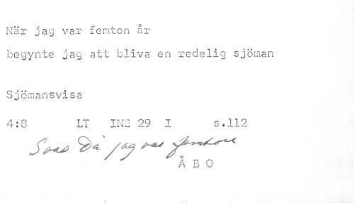 //// När jag var femton år //// begynte jag att bliva en redelig sjöman Sjömansvisa //// 4:8 LT INE 29 I s.112 //// ÅBO //// i > ////