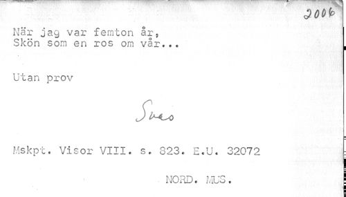 //// Nar jag var femton år, //// Skön som en ros om vår... , //// Utan prov //// S //// Mskpt. Visor VIII. s. 823. E.U. 32072 : //// • NORD. MUS. I ////