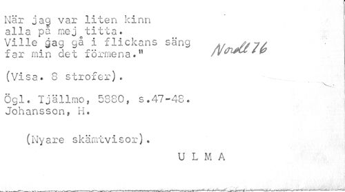 //// När ja§ var liten kinn alla pa mej titta. //// Ville gag gå i flickans säng jJ/76 //// far min det förmena." ** & //// (Visa. S strofer). //// Ögl. Tjällmo, 5380, s.47-48. Johansson, H. //// (Nyare skämtvisor). //// U L M A //// ^-i-___- _ ____,,--*-----------******---«M 4 ¦ i xl f* 4 "1' ** ¦ ^»s^w * ---- --*----t*------- ////