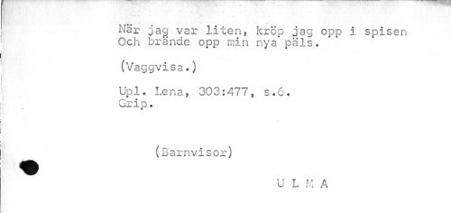 //// 11 //// När jag var liten, kröp jag opp i spisen Och brände opp min nya päls. //// (Vaggvisa.) //// Upl* Lena, 303:477, s.6. Grip. //// (Barnvisor) //// U L M A ////