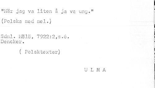 //// 1 //// "När jag va liten å ja va ung." (Polska med mel.) //// Sdml. Hölö, 7922:2,s.6. //// Dencker. f //// ( Polsktexter) | //// ¦ //// U L M A ////