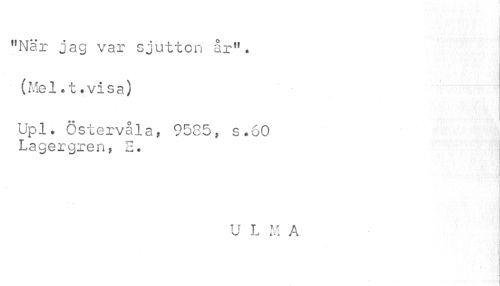 //// "När jag var sjutton år". //// (Mel.t.visa) //// i //// Upl. Östervåla, 9585, s.60 Lagergren, 2. //// U L M A //// i //// A //// 1 ////