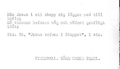 //// När Jesus i ett skepp sig lägger ned till hwila; //// Då stormar hafsens vvåg och wädret grufligt b 1 å s ; //// Sid. 26, "Jesus sofvver i Skeppet", 1 str. //// STERNWALL. SANG UNDER SEGEL. ////