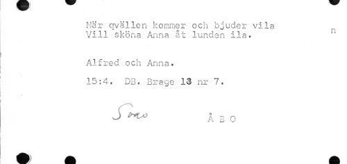 //// När qvällen kommer och bjuder vila Vill sköna Anna åt lunden ila* //// Alfred och Anna. //// 15:4. DB. Brage 13 nr 7. //// s //// S ^ ÅBO ////