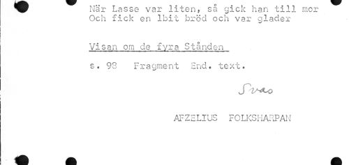 //// ^^ i\iar Lasse var iiten, sa gicic nan ti ijl mor //// Och fick en lbit bröd och var gläder //// Visan om de fyra Stånden s. 93 Fragment Hnd# text, //// AFZELIUS FOLKSHARPAN ////