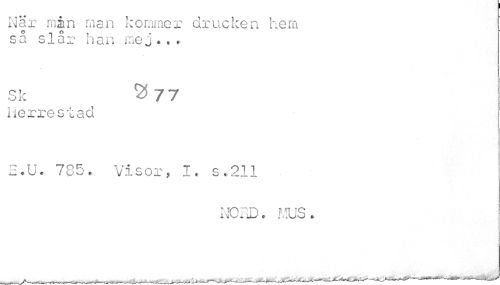 //// När mån man kommer drucken hem så slår han mej... //// Sk ^77 //// Herrestad //// E.U. 785 * Visor, I. s.211 //// NOidJ « MUS * //// ___ -^v-------^^^^tj» ////