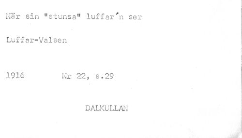 //// När sin "stunsa" luffaren ser Luffar-Valsen //// t //// f //// \ //// t //// i i //// 1 ! //// 1916 Nr 22, s.29 //// DALKULLAN ////