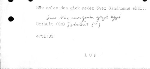 //// När solen den gick neder över Sandhamns skär.. //// A //// Urshult (Sm) $iJLv (3-) 4751:33 //// L U F ////
