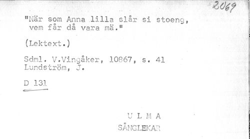 //// nI\iär som Anna .lilla slår si stoeng, vem får då vara mä,H //// (Lektext.) //// Sdml. V.Vingåker, 10867, s. 41 Lundström, J. //// D 131 //// ULM A ' i //// SÅNGLEKAR ////