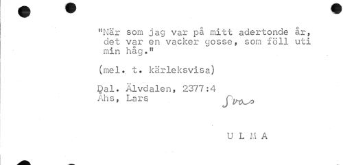 //// "När som jag var på mitt adertonde år, det var en vacker gosse, som föll uti min håg." //// (mel. t. kärleksvisa) //// Dal. Älvdalen, 2377:4 Ahs, Lars j //// U L M A ////