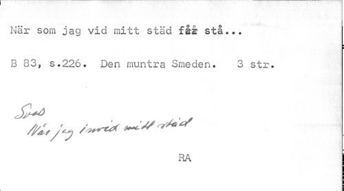 //// När som jag vid mitt städ fåå stå... //// ¦ ¦ //// B 83, s.226. Den muntra Smeden. 3 str. //// RA j ////