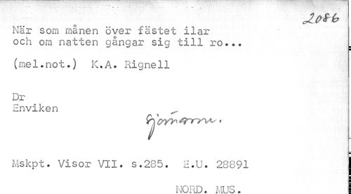 //// När som månen över fästet ilar och om natten gångar sig till ro... //// ¦ //// (mel.not.) K.A. Rignell Dr //// Enviken //// Mskpt. Visor VII. s.285. E.U. 28891 I //// NORD. MUS . I ////