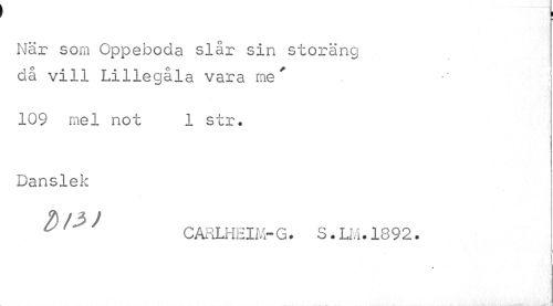 //// I //// ¦ //// När som Oppeboda slår sin storäng då vill Lillegåla vara me' //// 109 mel not 1 str. Danslek //// ^ J ^ CARLHEIM-G• S. LM* 1892. ////