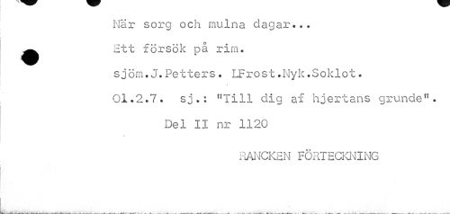 //// När sorg och mulna dagar... ^^ Htt försök på rim. //// sjöm.J.Petters. LF ro s t.Nyk.S ok1o t. 01.2.7. sj.: "Till dig af hjertans grunde". //// Del II nr 1120 //// •t //// RANCKEN FÖRTECKInIING ////