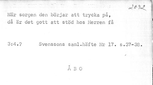 //// ~ - -* i- ---t --«. - t --- r- ?- ^ - A //// : J ^ I //// När sorgen den börjar att trycka på, //// ..v //// då är det gott att stöd hos Herren få //// i i //// 3:4.? Svenssons saral.häfte Nr 17. s.37-38. //// ÅBO ////