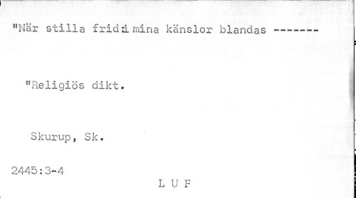 //// "När stilla fridamina känslor blandas --- //// ¦ ¦ //// "Religiös dikt. //// * - ~ , ¦ //// Skurup, Sk. //// ¦ //// 2445: 3-4 //// L U F ////