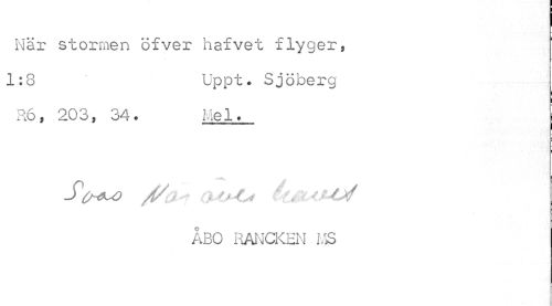 //// I //// När stormen öfver hafvet flyger, 1:8 Uppt. Sjöberg //// R6, 203, 34. Mel. j //// ÅBO RANCKEN MS ////