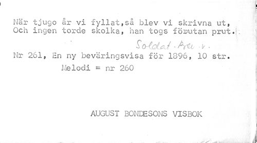 //// F //// 11 t > //// \ //// När tjugo år vi fyllat,så blev vi skrivna ut, i //// Och ingen torde skolka, han togs förutan prut. ; 1 //// Sö-lcU / - • 1/ • //// Nr 261, En ny beväringsvisa för 1896, 10 str* //// Melodi - nr 260 //// i //// i //// AUGUST BONDESONS VISBOK //// i ////
