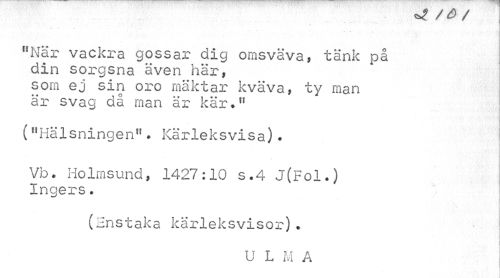 //// ^ / O / //// 11 När vackra gossar dig omsväva, tänk på din sorgsna även här, som ej sin oro mäktar kväva, ty man är svag då man är kär ?11 //// ("Hälsningen". Kärleksvisa). //// Vb. Holmsund, 1427:10 s.4 J(Fol.) Ingers. //// (Enstaka kärleksvisor). //// U L M A ////