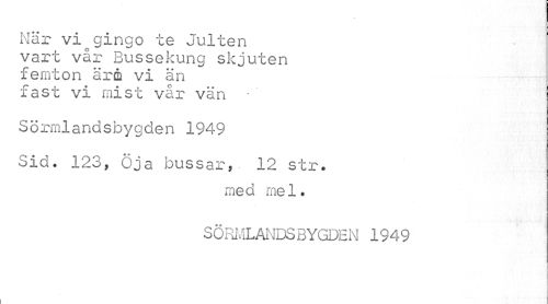 //// När viogingo te Julten vart vår Bussekung skjuten femton ärm vi än fast vi mist vår vän - //// Sörmlandsbygden 1949 //// Sid. 123, öja bussar, 12 str. //// med mel. //// SÖRMLANDSBYGDEN 1949 //// i ////