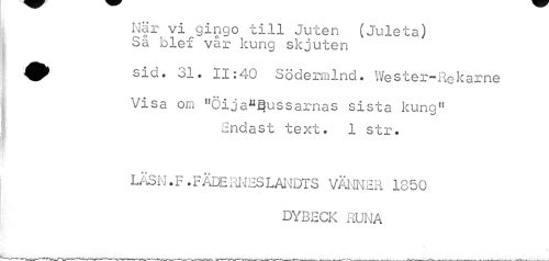 //// När vi gingo till Juten (Juleta) Så blef vår kung skjuten //// sid. 31. 11:40 Sodermlnd. Wester-Rekarne //// Visa om flÖijaphussarnas sista kung11 //// Endast text. 1 str. //// LASN.F.FADERNESLANDTS VÄNNER 1850 //// DYBECK RUNA ////