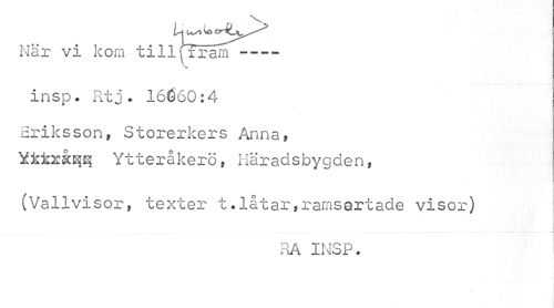 //// När vi kom till (Tram--- //// \ //// insp. Rtj. 16660:4 //// Eriksson, Storerkers Anna, Ytfcrås^ Ytteråkerö, Häradsbygden, //// (Vallvisor, texter t.låtar»ramsartade visor) //// RA INSP. ////