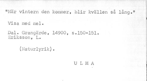 //// "När vintern den kommer, blir kvälle n s a lang." //// ¦ //// i //// Visa med mel. //// Dal. Grangärde, 14900, s.150-151. Eriksson, L. //// •v //// (Naturlyrik). //// U L M A //// m ] ////