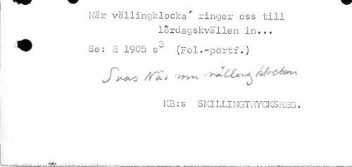 //// När vällingklocka' ringer oss till //// lördagskvällen in... //// ? Se: E 1905 (Fol.-portf.) //// J]^o < ^ r^Lce^ //// KB:s SKILLINGTRYCKSREG. //// » ////