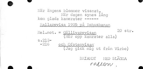 //// Nar ängens blommor vissnat, //// När dagen synes lång kora glada kamerater--- //// Ptallarevisa 1905 på Bohusbanan //// Mel*not. = Gällivarevisan ^ //// (Hör opp kamrater alla) //// s.213- //// -216 och Ofotenvisari //// (Jag gick mig ut från Virbo) //// BRIANDT MED SLÄGGA ////