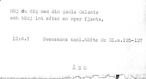 //// Nöj du dig med din gamla Galanta och börj int efter en nyer fjanta, //// 12:4.? Svenssons sarnl.häfte Nr 31.s.125-127 //// ÅBO //// ...•... _...^ -\ . V,___, ////