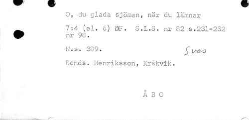 //// O, du glada sjöman, när du lämnar 7:4^(el. 6) SF. S.L.S. nr 82 s.231-232 //// N.s. 389. //// Bonds. Henriksson, Kråkvik. //// ÅBO //// X--^ ////