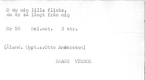 //// O du min lilla flicka, //// du är så långt från mig //// Nr 50 Mel.not. 3 str. //// (Åland. Uppt.a.Otto Andersson) //// BRAGE VISBOK ////