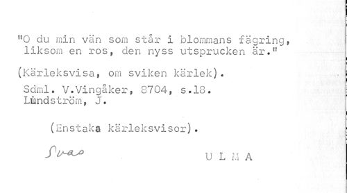 //// u0 du min vän som står i blommans fägring» liksom en ros, den nyss utsprucken är.u //// (Kärleksvisa, om sviken kärlek). • [ //// Sdml. V.Vingåker, 8704, s.18. j //// Lrnndström, J. //// (Jinstaka kärleksvisor) . //// JV*>* U L M A ////