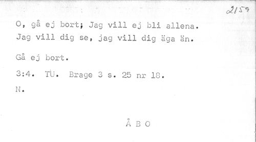 //// O, gå ej bort; Jag vill ej bli allena. Jag vill dig se, jag vill dig //// aga än. //// Gå ej bort. //// 3:4. TU. Brage 3 s. 25 nr 18. N. //// ÅBO ////