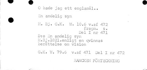 //// O hade jag ett englamål.. En andelig syn //// H. 3j . G.K. W. 10.6 v * ax 472 //// fragm. s. Del I nr 471 D:o En andelig syn //// H.Bj.1821.enligt en qvinnas berättelse om vision //// G.K. W. 79.6 v.af 471 Del I nr 472 //// RANCKEN FÖRTECKNING ////