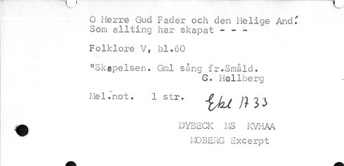 //// O Herre Gud Fader och den Helige And T Som allting har skapat - - - //// Folklore V, bl.60 //// "Skapelsen. Gml sång fr.Småid. //// G. Hallberg //// Mel.not. 1 str. ^ykil //// ^ DYBECK MS KVHAA //// MOBERG Excerpt ////