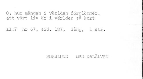 //// O, hur mången I världen förglömmer, att vårt liv är i världen så kort //// 11:7 nr 67, sid. 187, Sång, 1 str. //// i //// FORS LUND MED DALÄLVEN : //// i //// i ////