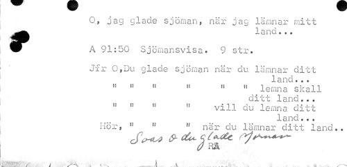 //// O, jag glade sjönian, när jag lämnar mitt - land. «. //// J| //// w^ A 91:50 Sjömansvisa. 9 str. //// Jfr O,Du glade sjöman när du lämnar ditt //// land« .. //// n 11 n M 11 11 ^ leran a skall //// ditt land... //// 11 11 tf 11 vill du lemna ditt //// land... //// Hör, " u M nar du lämnar ditt land.. //// rCp-tM f^^^ //// ^ rf m //// i . it.' ////