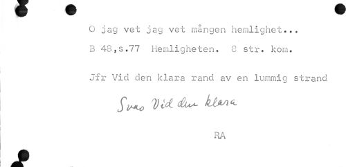 //// O jag vet jag vet mången hemlighet... B 48,s.77 Hemligheten. 8 str. korn. //// Jfr Vid den klara rand av en lummig strand //// Sp^o W* te***- //// RA ////