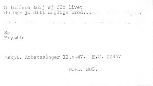 //// O luffare sörj ej för livet //// du -har ju ditt dagliga bröd... • : ' . > //// ¦ ¦ i //// -' • . * ' . « ^ « * . % i- ; f » //// . //// Sm //// Frysåle //// Mskpt. Arbetssånger II,s.47. E.U. 22467 //// NORD. MUS. ////