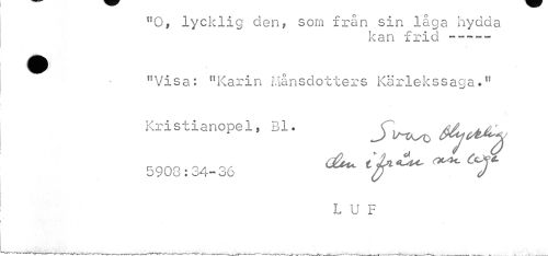 //// "O* lycklig den, som från sin låga hydda //// kan frid //// •I //// f!Visa: "Karin Månsdotters Kärlekssaga." Kristianopel, Bl. J^ ^^ //// 5908:34-36 ty^ 'T //// LUF //// I //// . | t i /. » . , ' l , V * ////