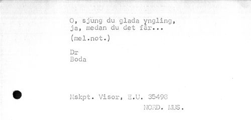 //// O, sjung du glada yngling, ja, medan du det far... //// (mel.not.) //// Dr Boda //// i //// W Mskpt. Visor, E.U. 35498 //// NORD. MUS. ////