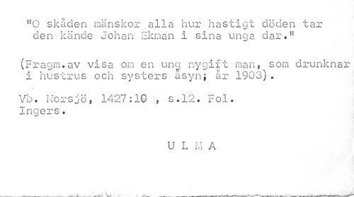 //// "O skåden mänskor alla hur hastigt döden tar den kände Johan Ekman i sina unga dar»11 //// (Fragm.av visa om en ung nygift man, som drunknar i hustrus och systers asyn; år 1903). //// A / //// Vb. Horsjö, 1427:IG , s.12. Fol. //// Ingers. //// U L M A ////