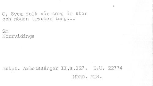 //// O, Svea folk vår sorg är stor och nöden trycker tung*.. //// Sm //// Norrvidinge ; //// i //// Mskpt. Årbetssånger II,s.127. E.U. 22774 //// NORD. MUS. ////