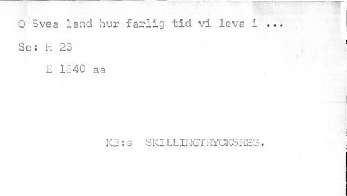 //// O Svea land hur farlig tid vi leva i ... //// i //// Se: H 23 //// E 1840 aa //// KB:s SKILLINGTRYCKSHEG. ////