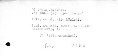 //// -... . •• //// - t ' r t r f" //// "O tysta ensamhet, //// var skall jag nöjen finna.11 //// (Visa om olycklig kärlek). //// Sdml. St.Malm, 10922, s. 606-607. Nordin-Grip, I. //// (O, tysta ensamhet). //// • f^ u L M A ////