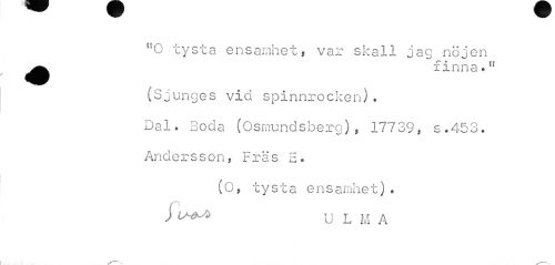 //// "O tysta ensamhet, var skall jag nöjen ^^ finna *11 //// (Sjunges vid spinnrocken). //// Dal. Boda (Osmundsberg), 17739, s.453. //// Andersson, Fräs E. //// (O, tysta ensamhet). //// J ^^ U L M A ////