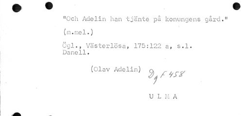 //// "Och Adelin han tjänte på konungens gård." (m • me 1 *) //// 5gl«, Västerlösa, 175:122 a, s. 1. Daneli. //// (Olav Adelin) ^ //// U L M A ////
